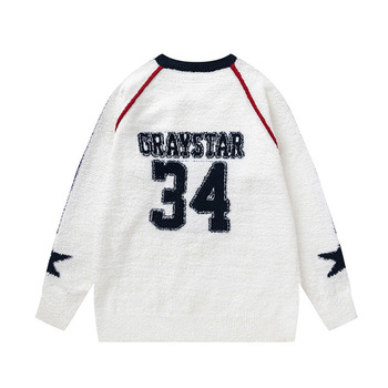 เสื้อสเวตเตอร์คอวีสไตล์นักศึกษาย้อนยุคอเมริกันย้อนยุคสีขาวฤดูใบไม้ร่วงฤดูหนาวมีโลโก้ด้านหน้าระบายอากาศ