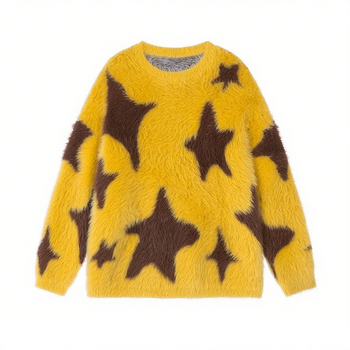 เสื้อสเวตเตอร์วินเทจย้อนยุคของผู้หญิง OEM ออกแบบได้ตามต้องการด้วยผ้าแจ็คการ์ดสีตัดกันคอกลมแบบถักสไตล์ลำลอง