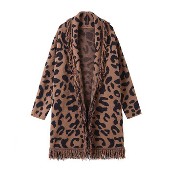 เสื้อสเวตเตอร์ถักยาวคอวีของผู้หญิงเสื้อสเวตเตอร์ถักลายเสือดาวสีน้ำตาลโลโก้ตามสั่ง